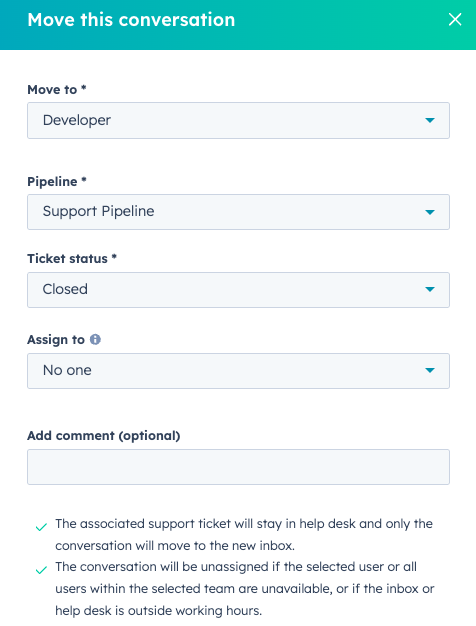 - Move the ticket/conversation to the 'Developer' inbox.