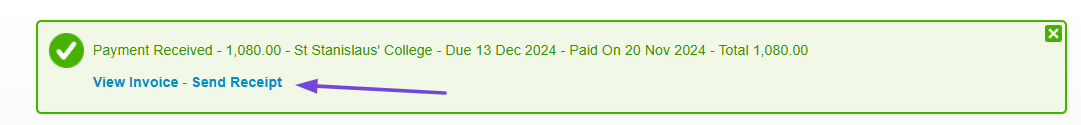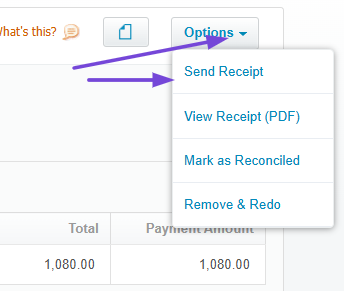 Alternatively, you can send the receipt by selecting the option from the dropdown menu found when you click the payment link in the invoice.
