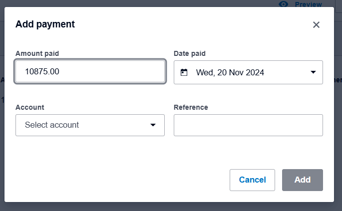 - Add the payment details and click "Add." Ensure the amount paid and the date are correct, and select the relevant account from the dropdown (usually CBAxxx5429).